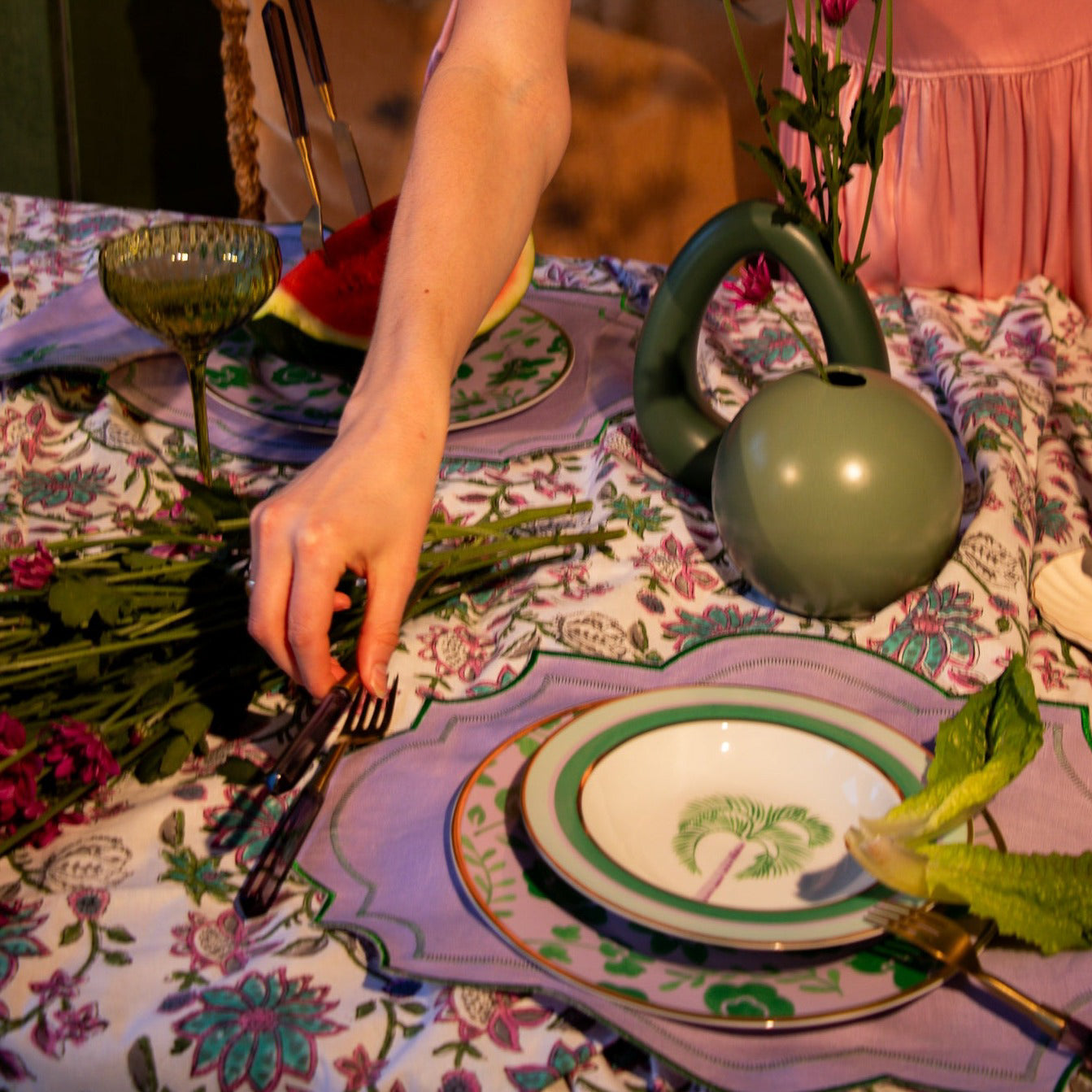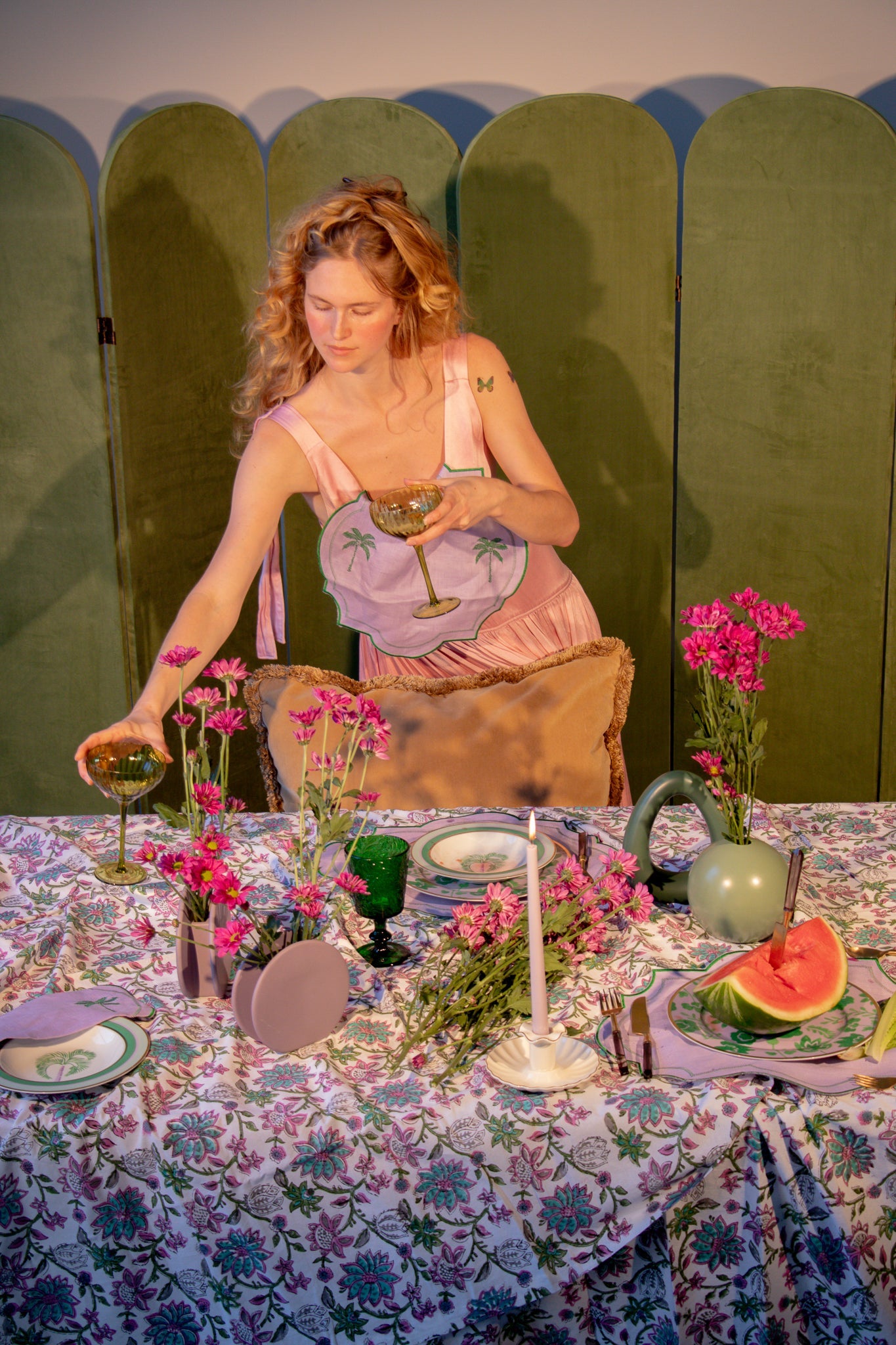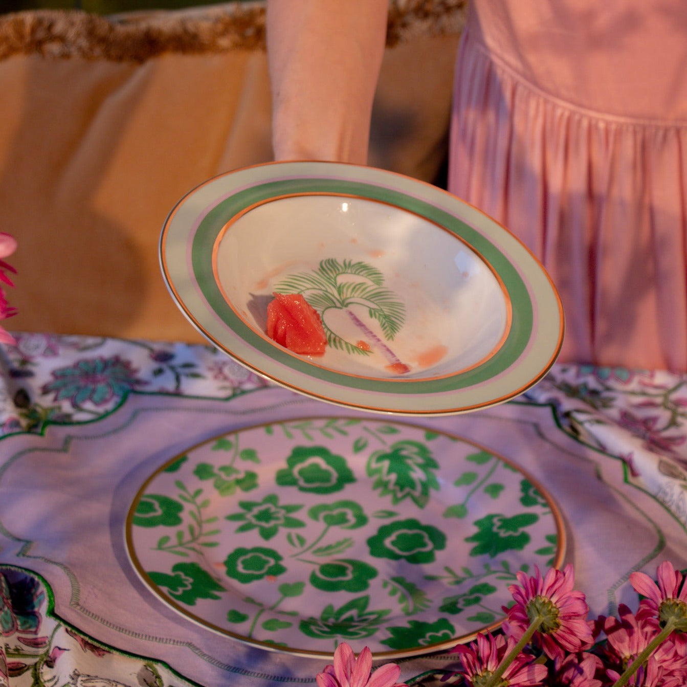 A standout piece from our Vintage Palm Collection, this bowl boasts a hand-drawn verdant palm tree and lilac stem intricately illustrated as if swaying with the breeze. Gold outer rim complemented by inner rings of pistachio, lilac, and dark green encircle the bowl edge. The contrast captures the fusion of earth and art, nature and nurture. Whether presenting a soup, pasta, or a light course, it promises to be a cherished addition to your table.