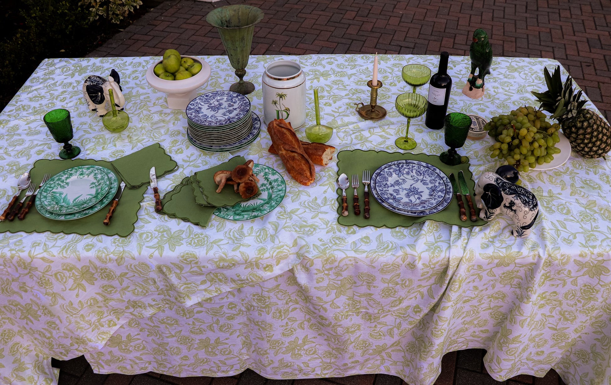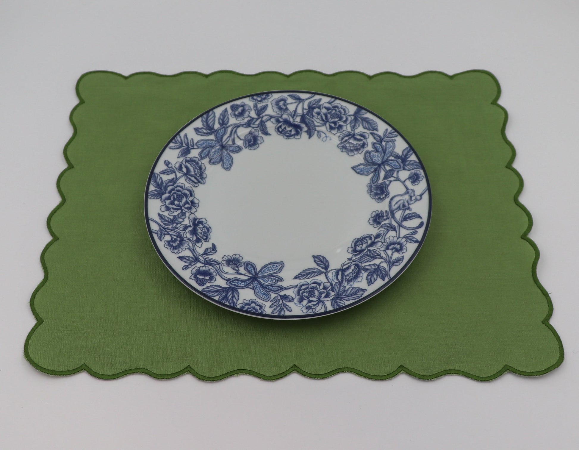 Part of our Shimla Social Collection, the Bombay Blue Dinner Plate captures the whimsy of a dense jungle, intricately painted in a safari green with branching tendrils, lush leaves, and vibrant blooms. The enchanting foliage is displayed around the plate's border, creating a decorative frame and white center. If you look closely enough, you may even be able to spot a monkey hanging off a bough. Can be matched with Shimla Social coordinating pieces to create a complete place setting.