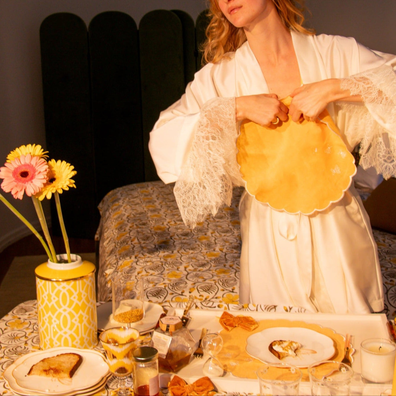 Add our Bumble Voyage Placemat for a playful addition to your table. Crafted in honeyed yellow linen with a crisp white trim, it features charming bees taking a voyage. Perfect for adding a touch of whimsy to any dining occasion. Pair it seamlessly with our coordinating napkin.