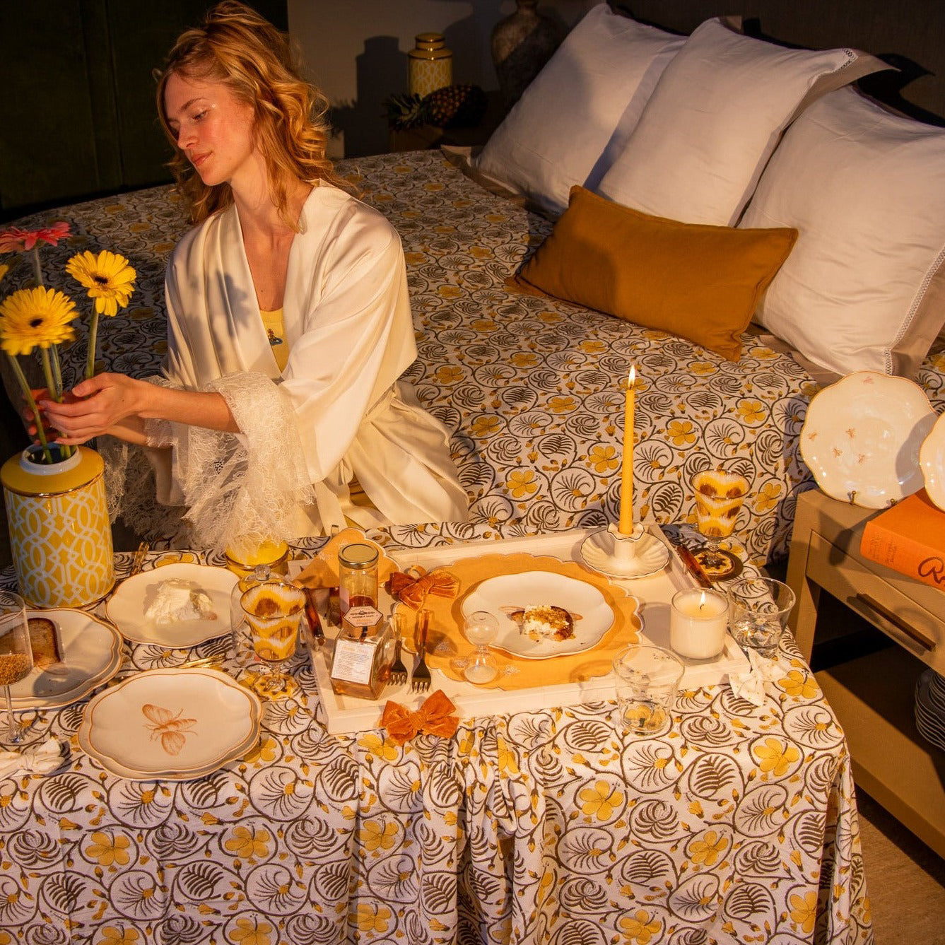 Effortlessly captures the delicate beauty of nature's most diligent workers - a quartet of finely sketched bumblebees embarks on their silent journey in honey gold and pink, hand drawn as if they are about to buzz right off the plate. The aerial ballet is accentuated by the plate's honey-gold rim, a nod to nature's golden nectar. Whether it's a sunlit breakfast or a candlelit dinner, the plate brings a touch of summer's fleeting beauty and the tireless dance of the bumblebees.