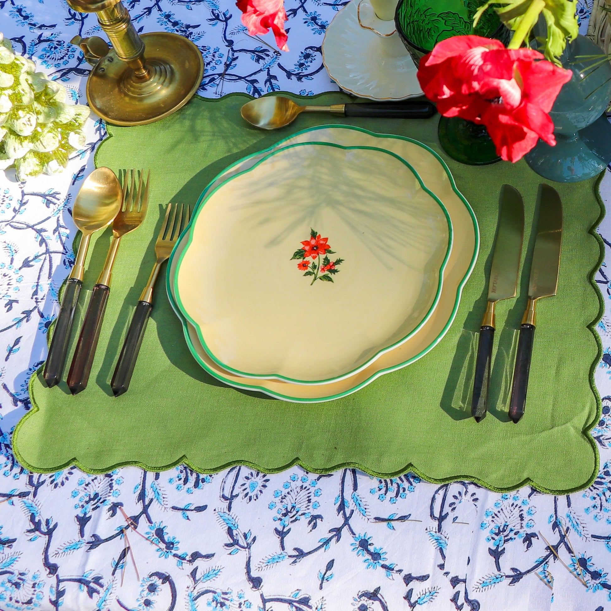 Steeped in tradition and English charm, the Chinoiserie Blue Blockprint tablecloth beckons one to an era of classic elegance. Vignettes of whimsical flora and fauna dance across the fabric, reminiscent of the ornate patterns found on traditional blue and white porcelain wares. Each pattern, meticulously block-printed, offers a nod to the rich cultural exchange between the East and West. Lay it on your table amongst a spread of sandwiches and scones with clotted cream and jam, and transport your guests to a stately English manor.