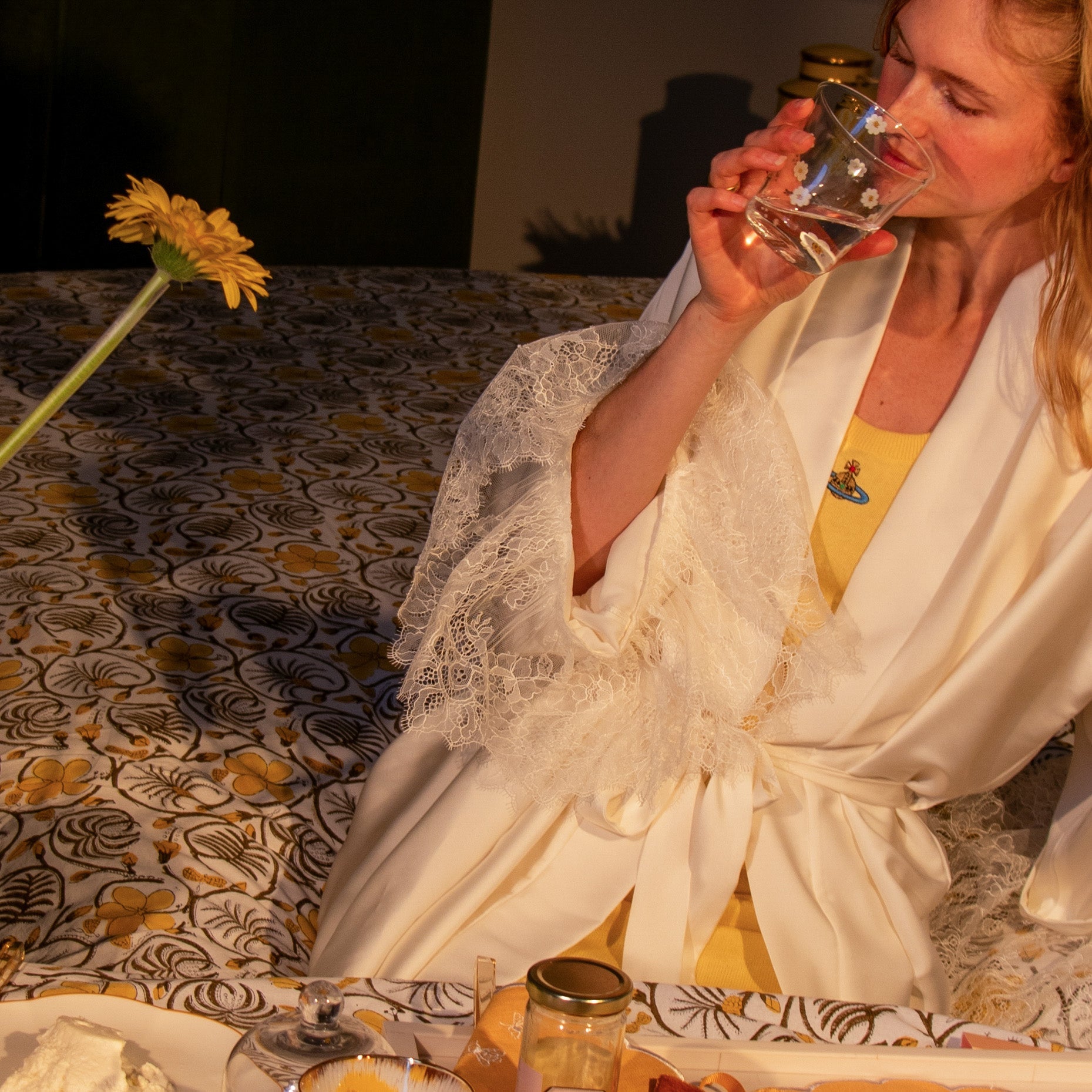 60's Daisy motifs are hand-painted sporadically across the glass tumbler.