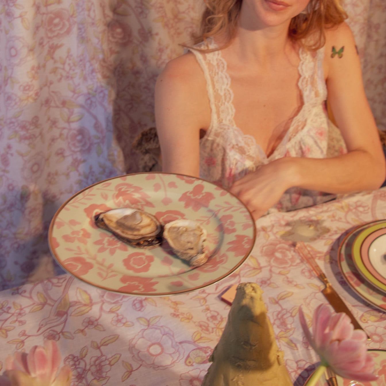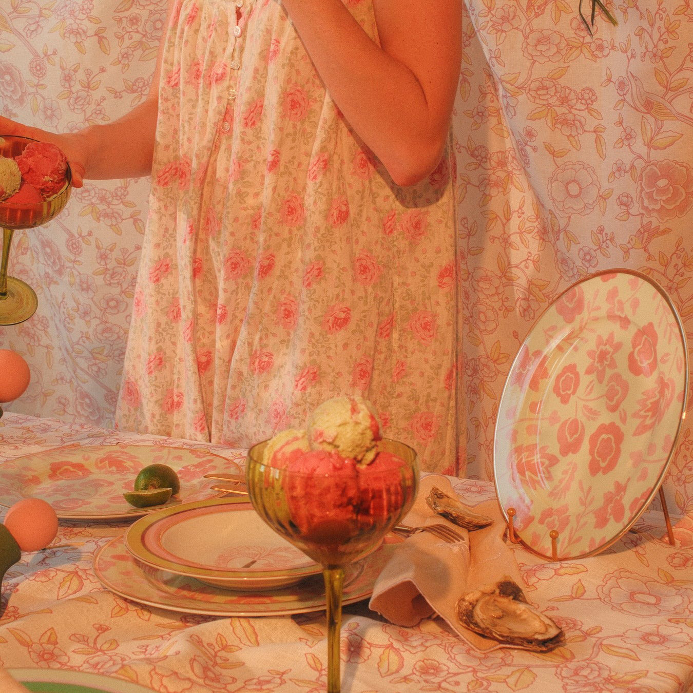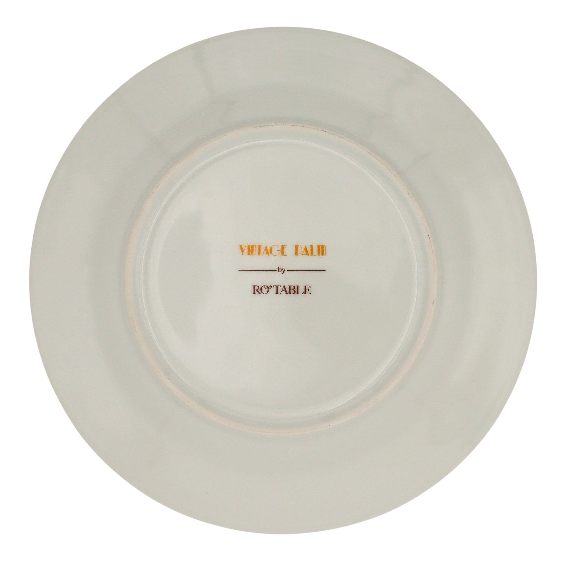 Step into a nostalgic coastal and desert rendezvous with our Pistachio & Lychee Palm Dinner Plate. Hand-drawn blooms and leaves in soothing blush shades, against a pastel pistachio sorbet shade that echoes the timeless allure of beach sunsets and sweeping desert landscapes. Designed for the contemporary soul who is forever young at heart. Encircled with a gold rim.