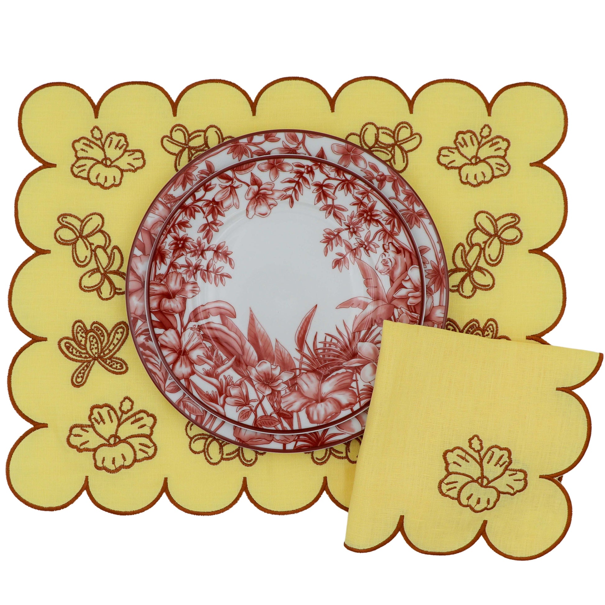 Indulge in nostalgia with our Tawny Marigold Napkin, an addition to our Vintage Palm Collection. Crafted from 100% linen in a warm yellowish hue, the intricate scalloped trim and decorative motif transport you to bygone sun-kissed destinations, adding a touch of timeless allure to your table settings. Pair it with our coordinating dinnerware to create a serene oasis of style.