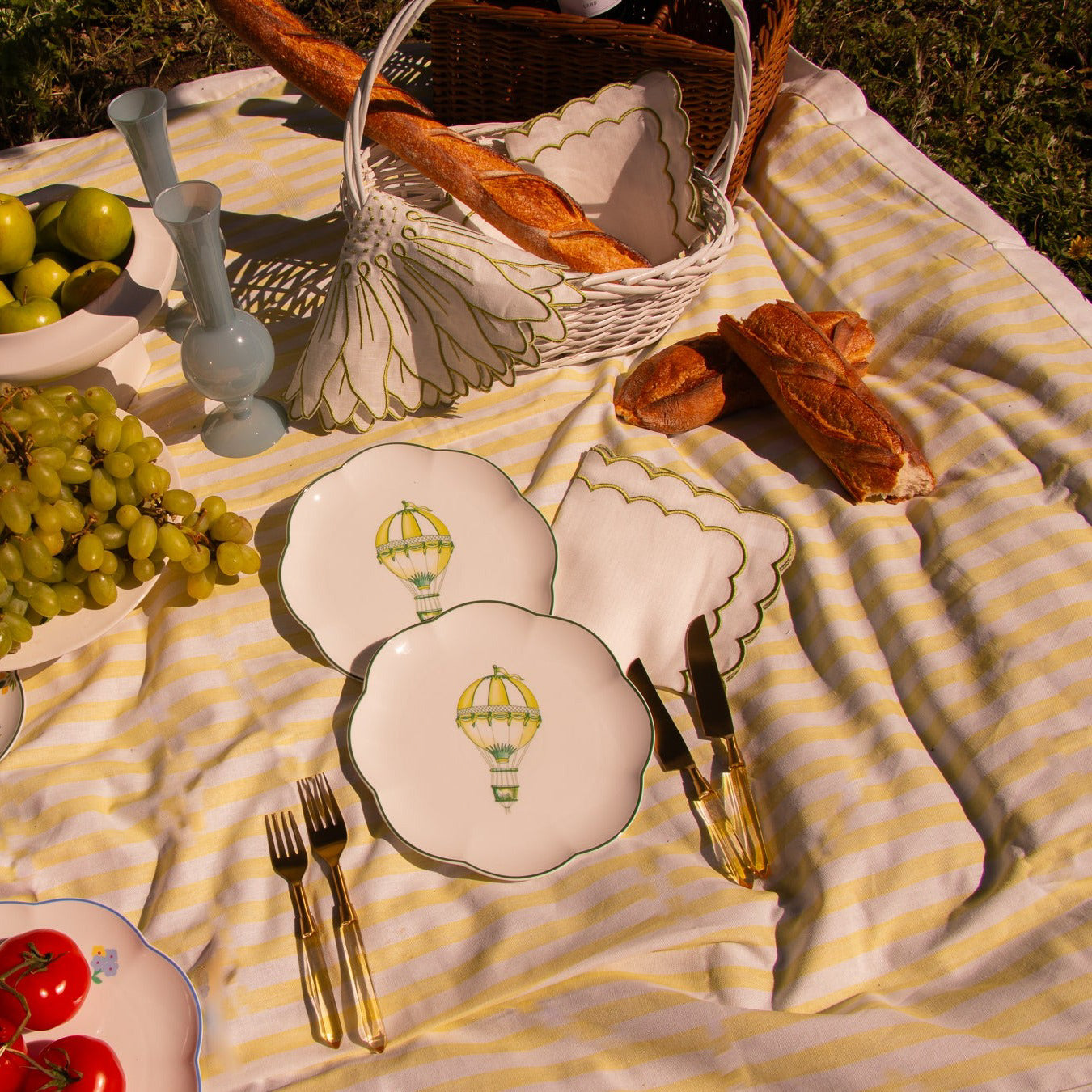 The Valensole Lavender Starter Plate encapsulates the essence of a dreamy afternoon in Provence with a hand-drawn hot air balloon in soft green and yellow tones and a muted green scalloped rim. Serving more than just appetizers, this plate promises a journey to the heart of the French countryside.