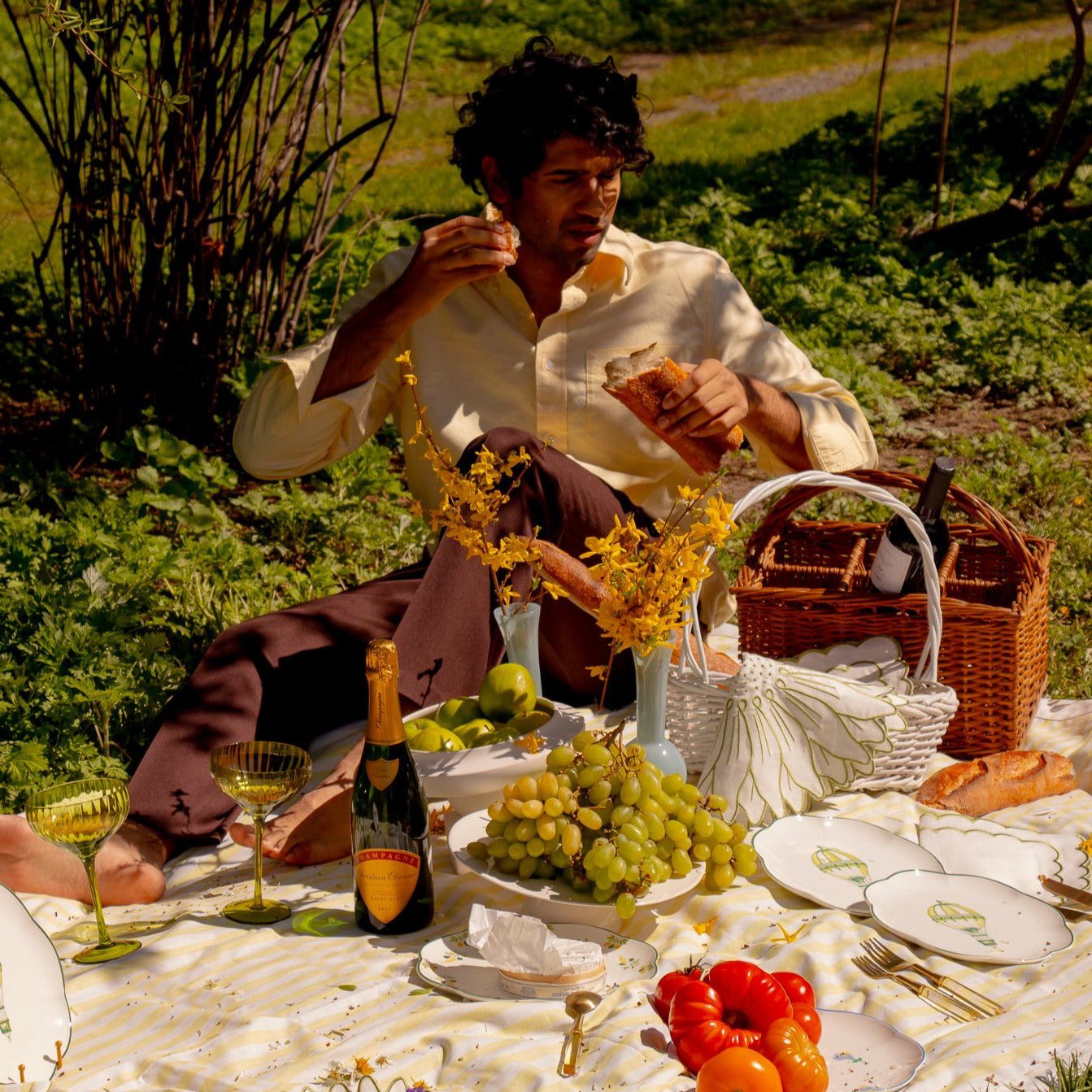 The Valensole Lavender Starter Plate encapsulates the essence of a dreamy afternoon in Provence with a hand-drawn hot air balloon in soft green and yellow tones and a muted green scalloped rim. Serving more than just appetizers, this plate promises a journey to the heart of the French countryside.